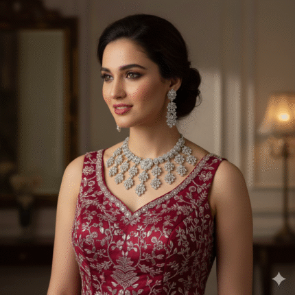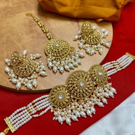Jodha Jadau Reverse AD Necklace Set with Sahara, Passa & Teeka (white/golden)
