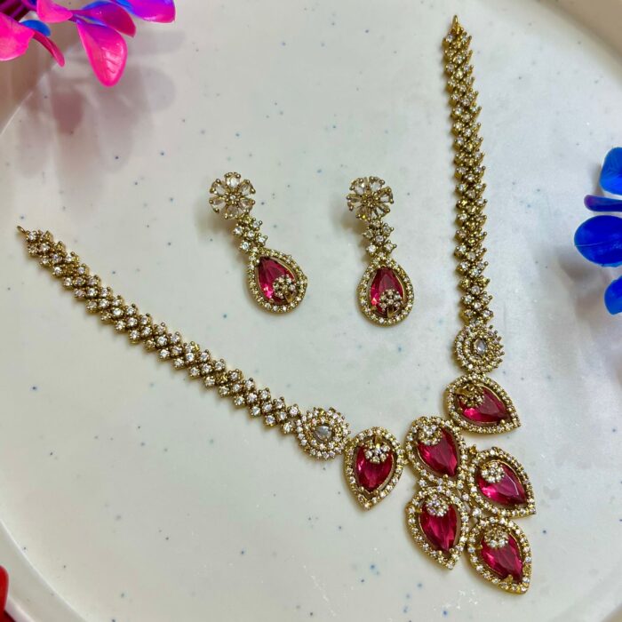Home All Products Divya AD Necklace Set – Mehendi Polish (Ruby Red)