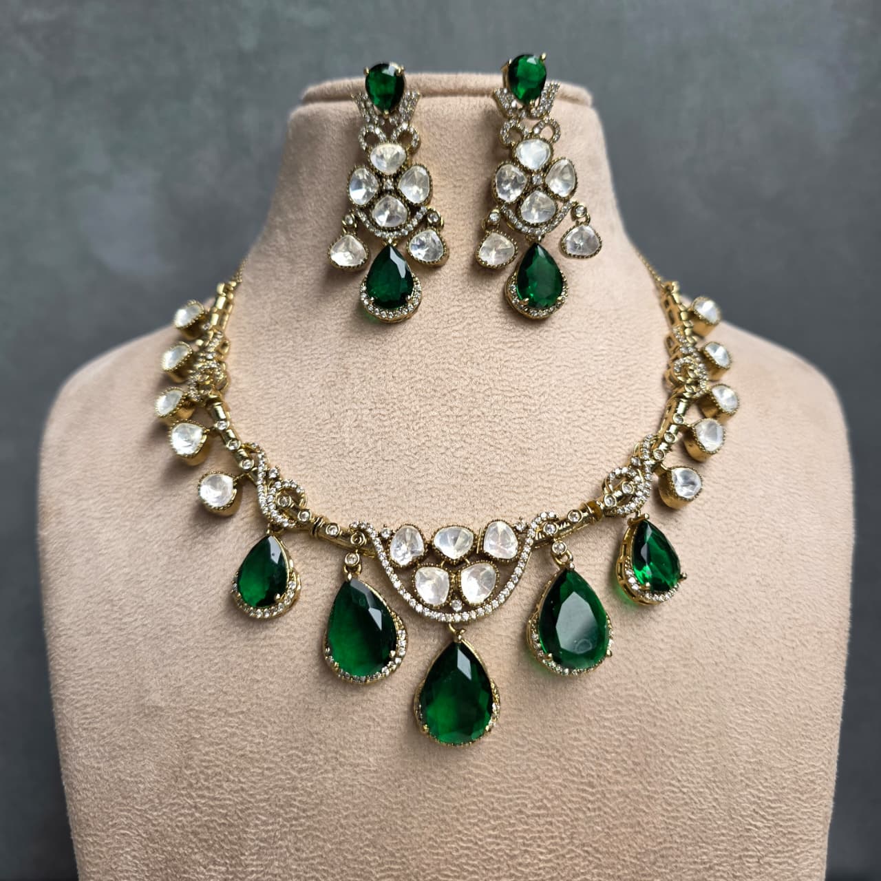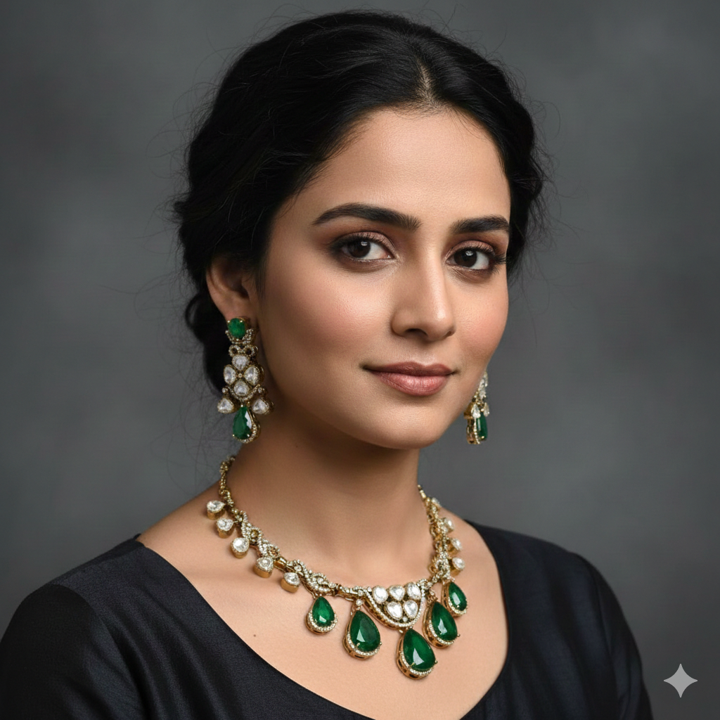 Home All Products Madhura Moissianite Necklace with Duplet Stones (Emerald Green)