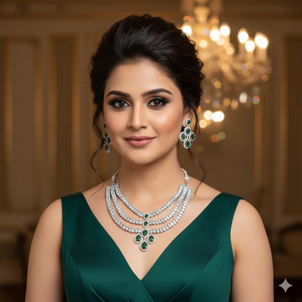 Home All Products Nyra 3 Layer AD Necklace Set (Green)
