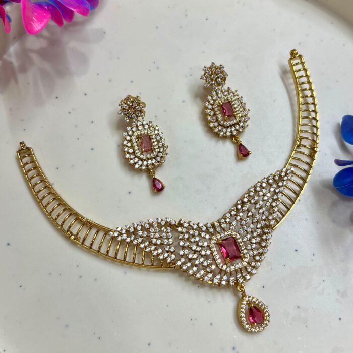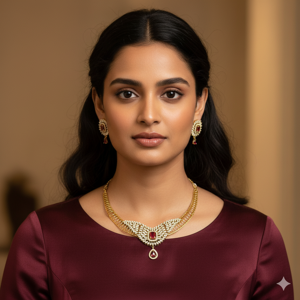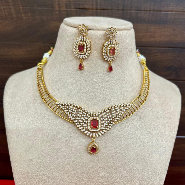 Home All Products Padma AD Necklace Set – Mehendi Polish (Ruby Red)