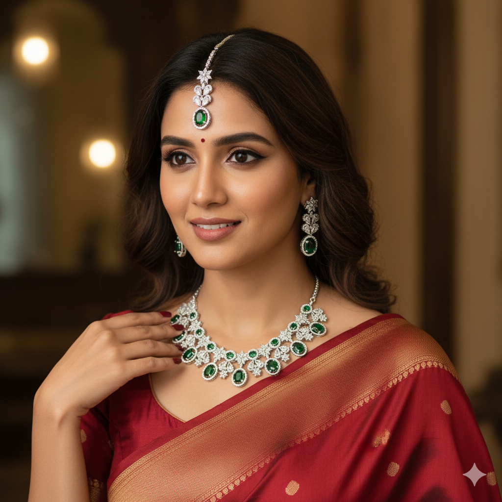 Home All Products Pinal AD Necklace Set with Mangtika (Green)