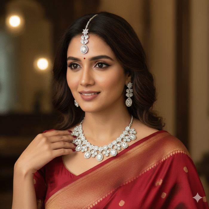 Pinal AD Necklace Set with Mangtika (Green) ₹2,500.00 Original price was: ₹2,500.00.₹1,465.00Current price is: ₹1,465.00.