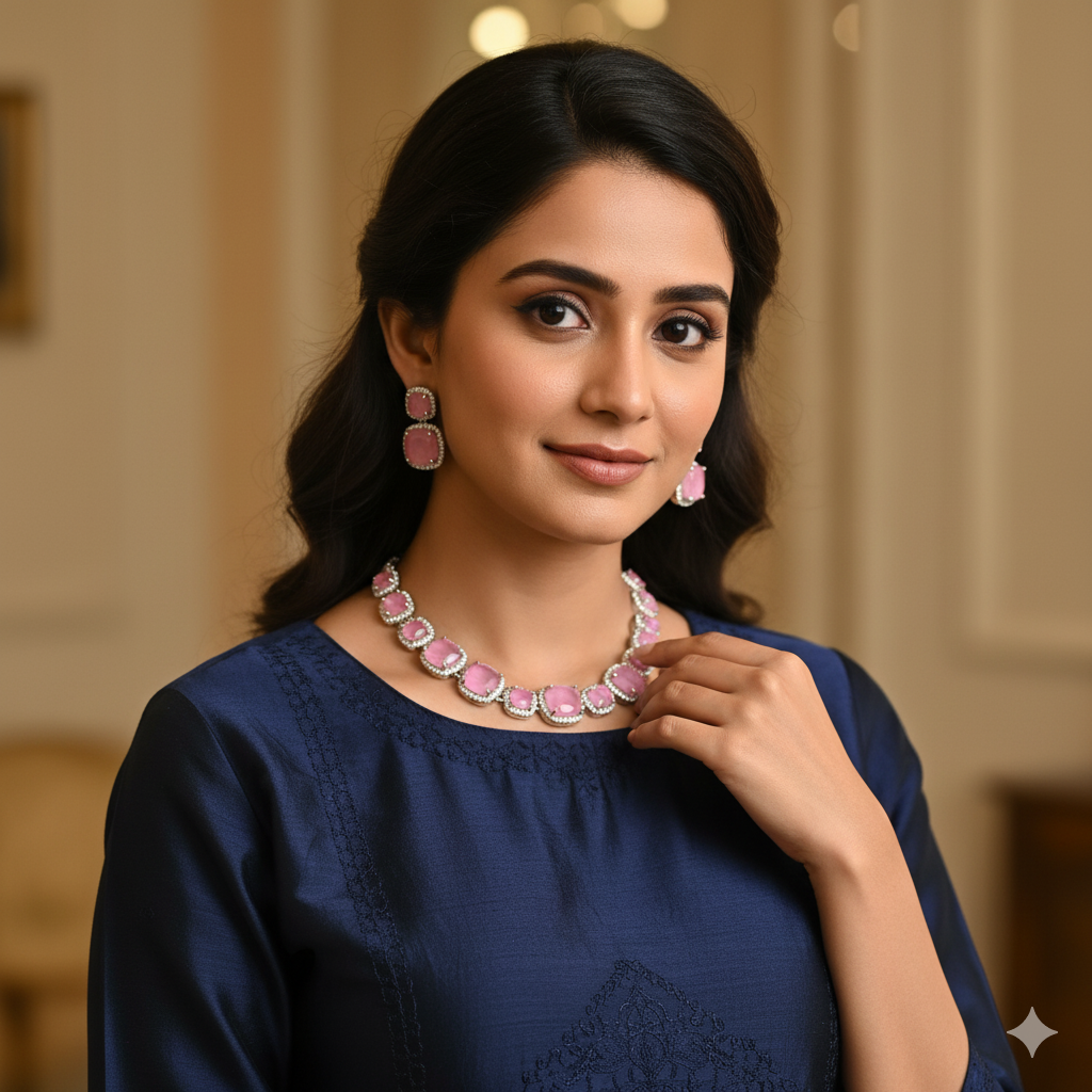 Home All Products Rhea AD Necklace (Pastel Pink)