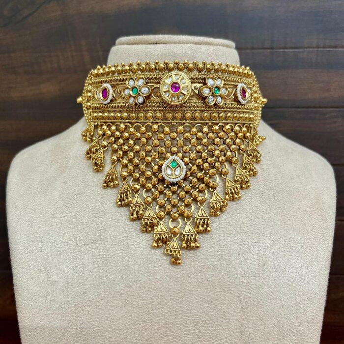 Minakshi Premium High Gold Polish Rajwadi Jhalar Necklace ₹2,500.00 Original price was: ₹2,500.00.₹1,650.00Current price is: ₹1,650.00.