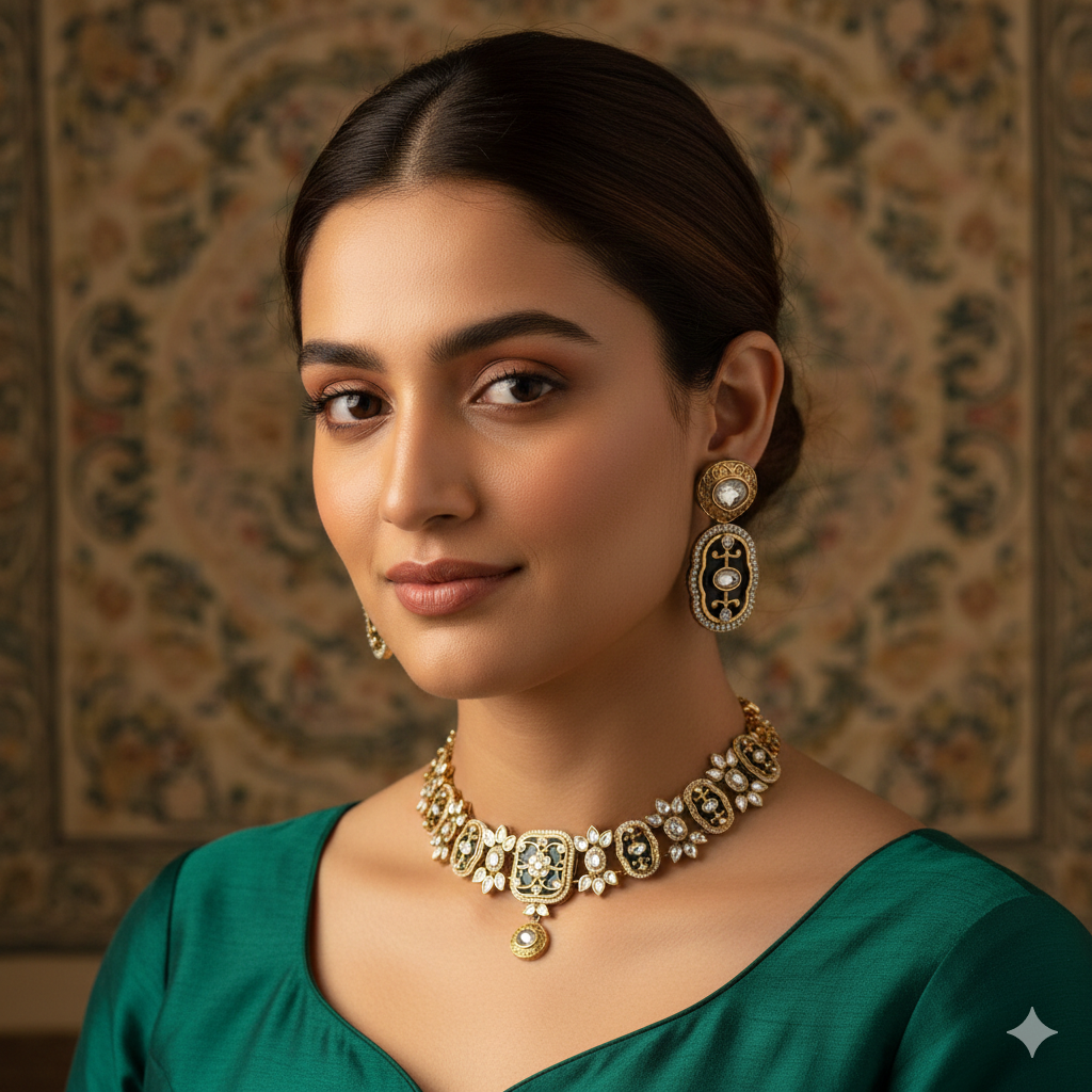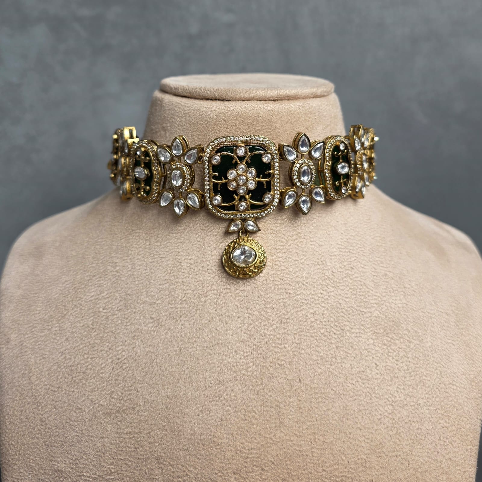Home All Products Vastu Premium Kundan Choker Set (Dark Green)